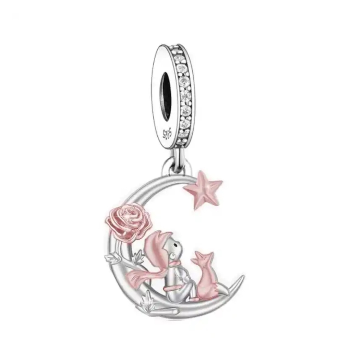 Apresentamos o nosso encantador berloque em forma de coração, uma peça delicada e cheia de significado. Este berloque apresenta uma cena adorável do Pequeno Príncipe com a raposa, capturando a essência da clássica história.